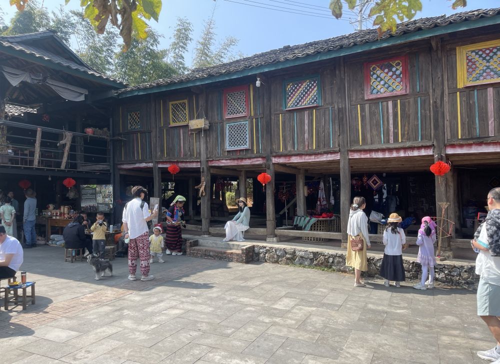游客在出冬瓜村干栏式建筑民居游玩。新华社记者王优玲 摄