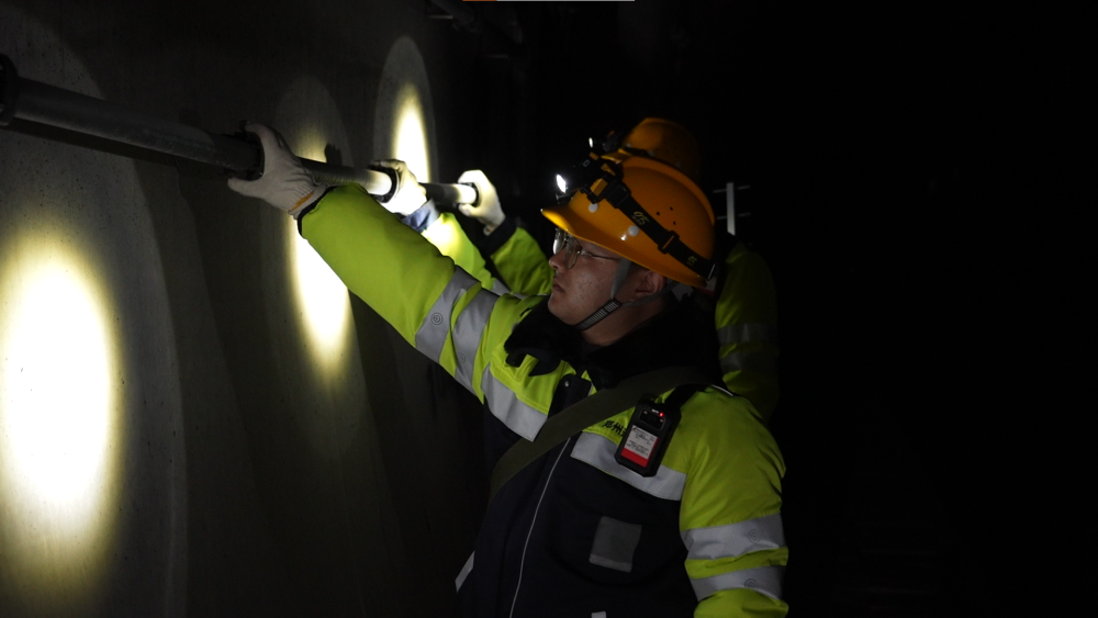 “这是我们的通信漏泄电缆,信号就是通过这些线缆来发送和接收的,就像我们室外的天线。”工长燕政旭一边介绍,一边使用扳手对洞壁上固定线缆的卡具进行细致检查,“气温越低,隧道壁越容易渗水,这些线缆长期处于湿冷环境中,卡具特别容易松动。”