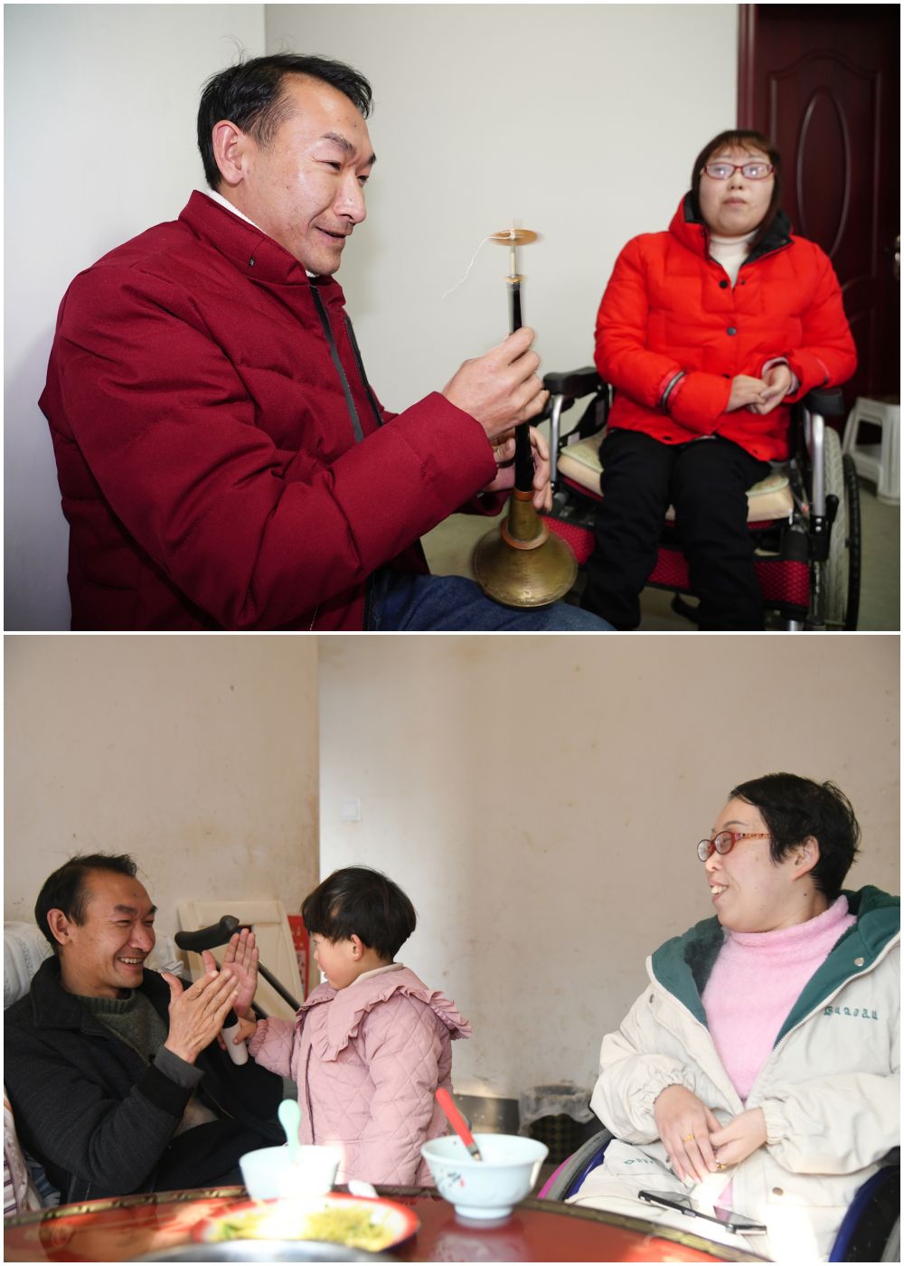 这是一张拼版照片,上图为:2019年1月6日,牟文贵(左)在家为妻子吹奏唢呐(新华社记者邵瑞摄);下图为:2024年12月29日,牟文贵(左一)在家与女儿玩耍(新华社记者张博文摄)。