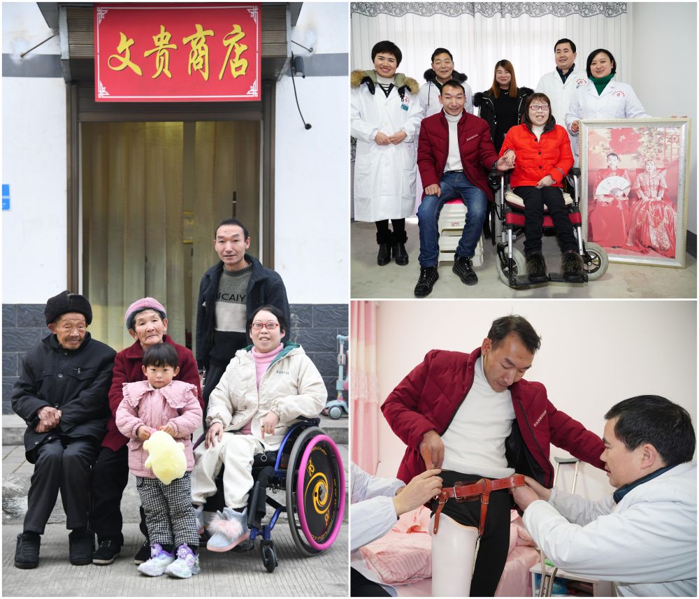 这是一张拼版照片。左图为:2024年12月29日,牟文贵(后)、曹晓霞(右一)与家人在自家开设的商店前合影(新华社记者张博文摄);右上图为:2019年1月6日,新年刚拍完结婚照的牟文贵(前左)夫妇与他们的家庭医生签约服务团队合影(新华社记者邵瑞摄);右下图为:2019年1月6日,家庭医生团队的医生在为右腿截肢的牟文贵(中)穿戴义肢(新华社记者邵瑞摄)。