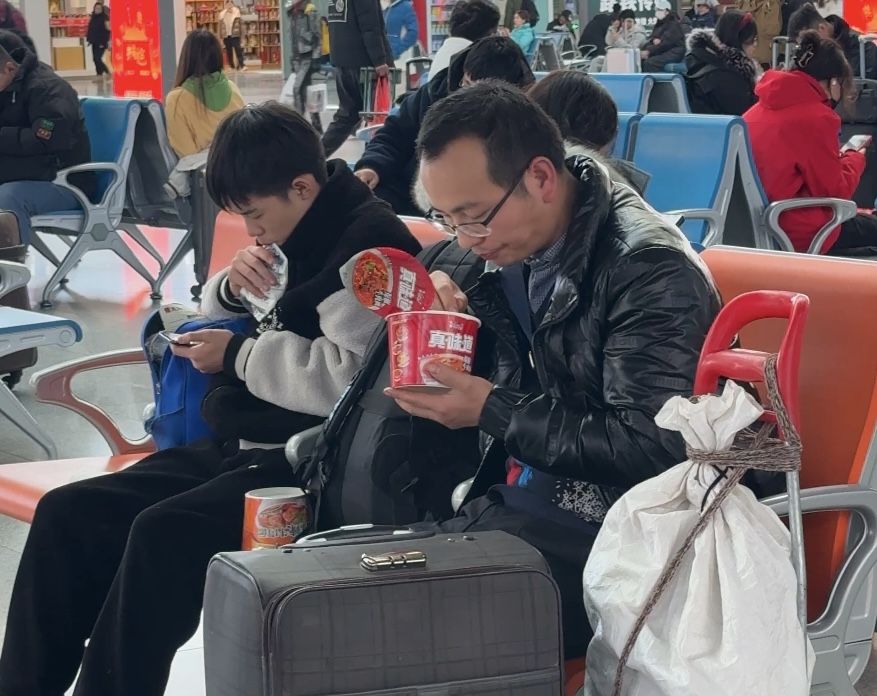候车大厅的角落里,袁茂林正吃着方便面,身旁堆着几件大大小小的行李,等待开往天津武清的列车到站。39岁的袁茂林在天津从事制造业,平时工作繁忙,很少回家,春节便是这难得的机会。