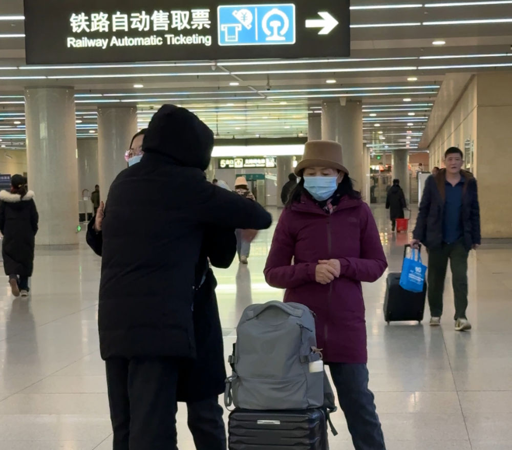 检票口处,60多岁的杜女士正和儿子女儿道别。这是她和丈夫第一次从东北来天津过年,特意来到孩子工作的地方,看看孙女,和家人团聚。