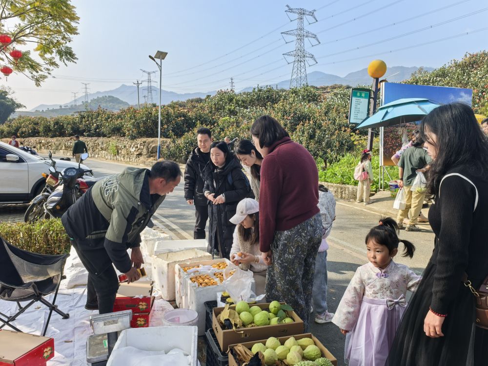 2月2日,游客在龙华村购买水果。新华社记者李倩薇 摄