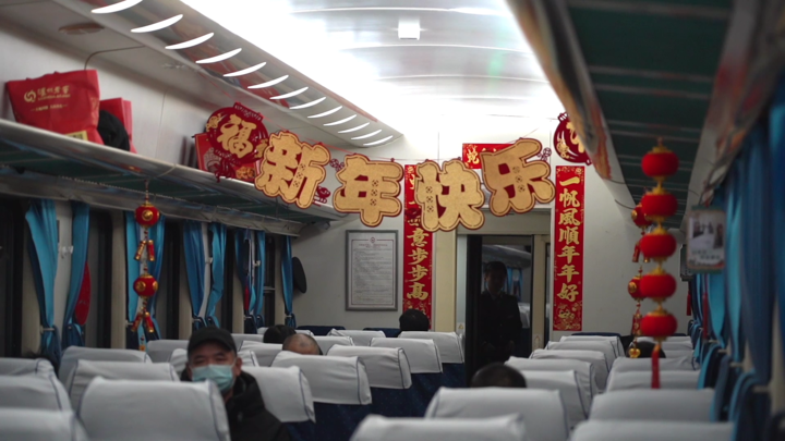 8818次列车上,乘务组精心布置车厢,营造新年氛围。新华社记者 邓浩然 摄