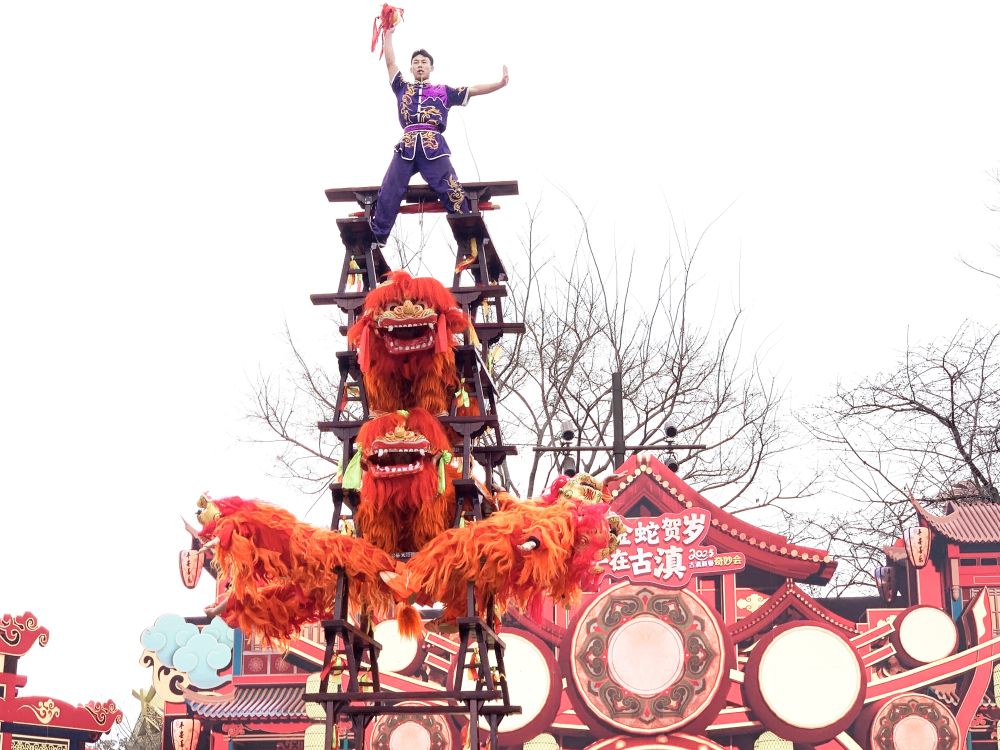 1月29日至2月16日,在云南省昆明市的七彩云南欢乐世界,观众每天都能看到来自山西的天塔狮舞表演。25条长板凳搭成13层高,宛如“天塔”。锣鼓响起,领狮人身手敏捷,在塔内翻转攀爬,逗引两只“大狮子”和四只“小狮子”向上攀登。登顶后,群狮洋洋得意,做出“水中捞月”“蜻蜓点水”“瑶池摘星”等动作,赢得观众阵阵喝彩。