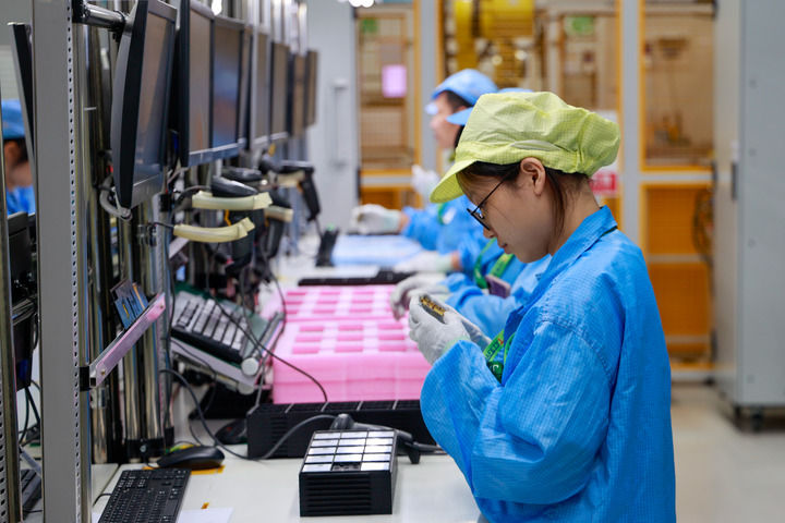 2025年9月15日,工作人员在江苏无锡高新区综合保税区捷普电子(无锡)有限公司的生产车间里进行产品检验。新华社记者 刘佳琪 摄