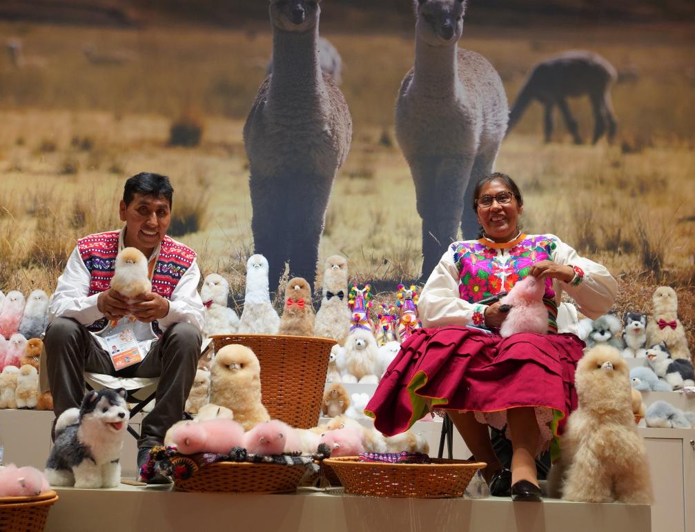 新华社上海11月7日电(记者吴梦、周蕊、方喆)身着印第安人传统民族服饰,秘鲁手工艺人奥斯瓦尔多·马马尼用自制的工具将羊驼玩偶的皮毛梳理得柔顺蓬松。一旁的妻子格洛丽亚为玩偶缝制表情,寥寥几针便勾勒出一抹传神的“微笑”。