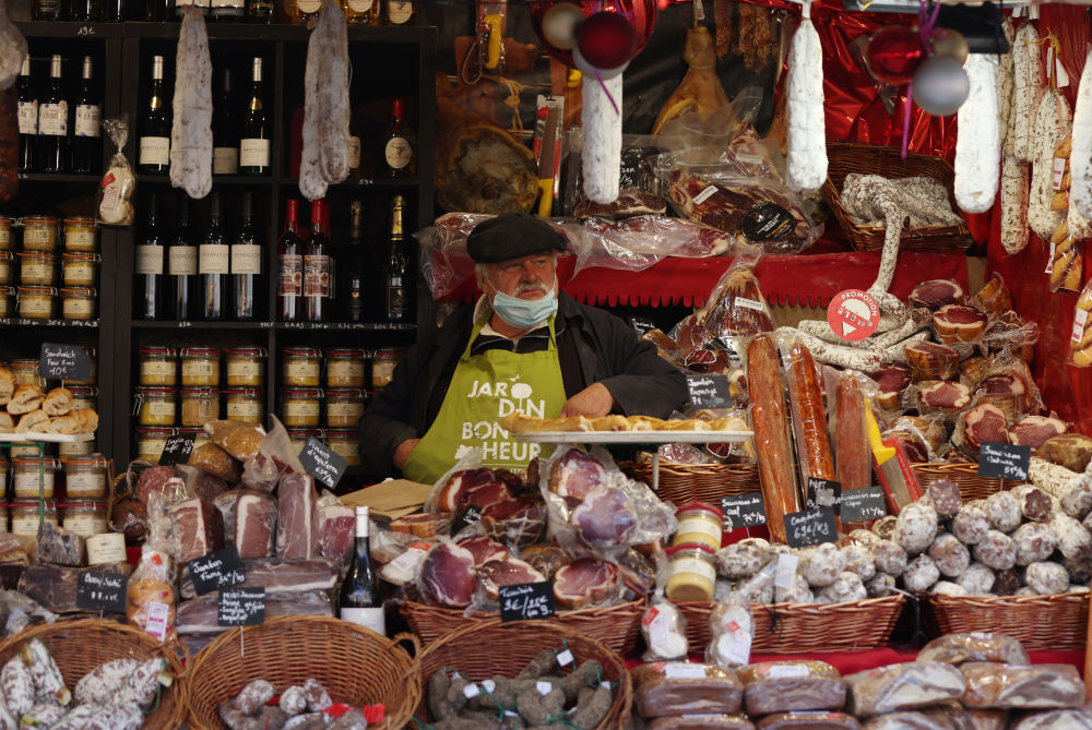 2021年12月9日,在法国巴黎的一处圣诞市场,一名摊主在摊位前等待客人光临。新华社记者高静摄