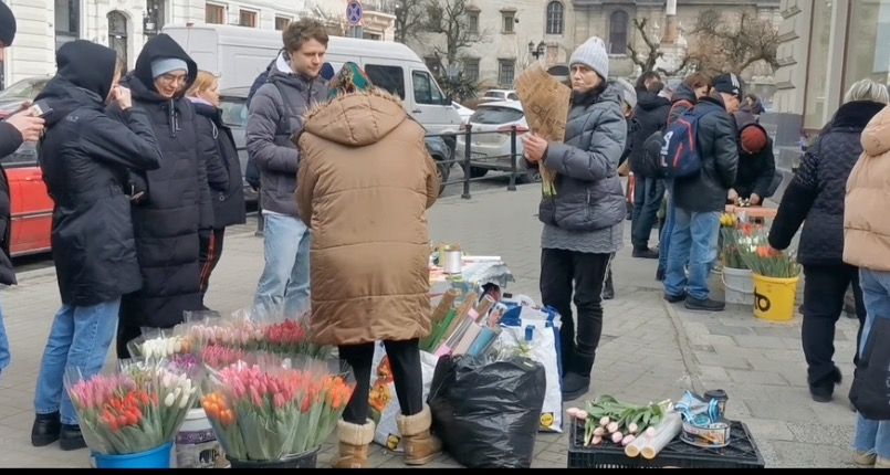 3月8日是国际妇女节。在乌克兰西部城市利沃夫老城区,街边出现一个小型“花市”,来买花的人络绎不绝,准备送给女性亲友。