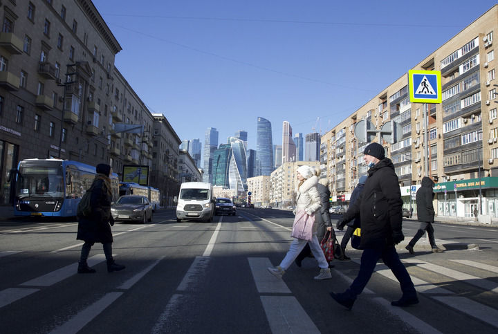 3月9日,在俄罗斯首都莫斯科,市民穿过一条马路。俄罗斯总统普京8日签署法令,对制裁条件下的国民和企业给予支持。新华社记者 白雪骐 摄