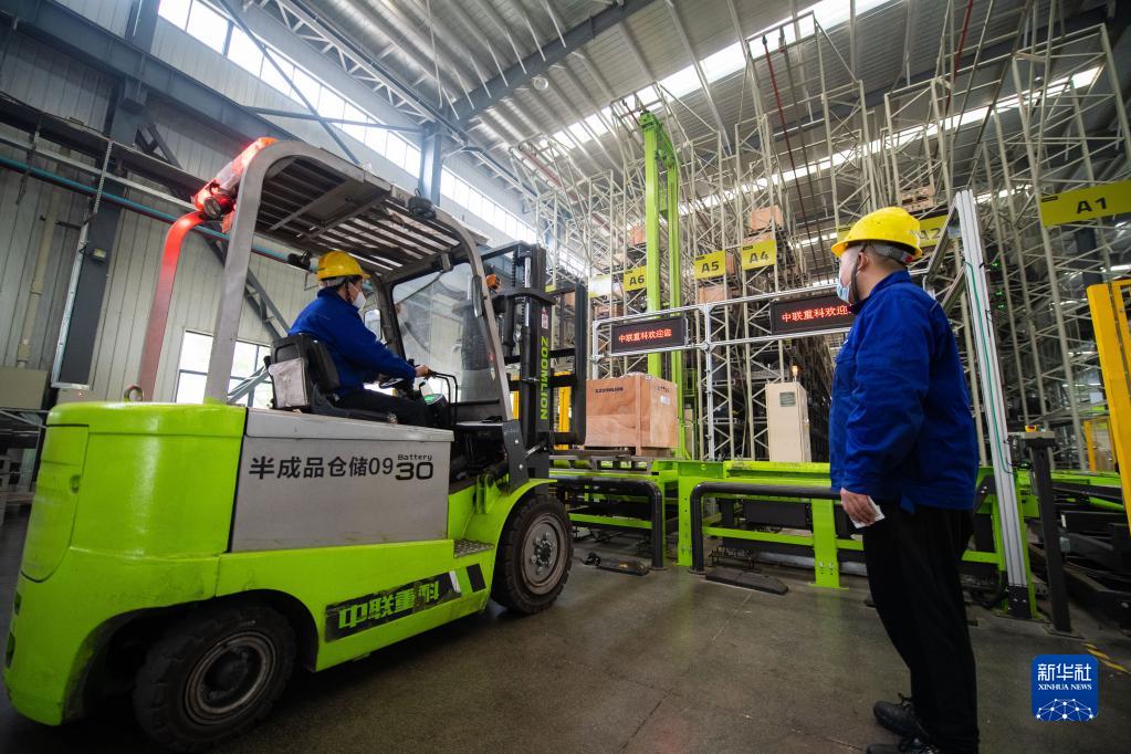 1月13日,在位于常德高新区的中联重科建筑起重机械有限责任公司生产车间,工作人员把生产的产品零部件入库。