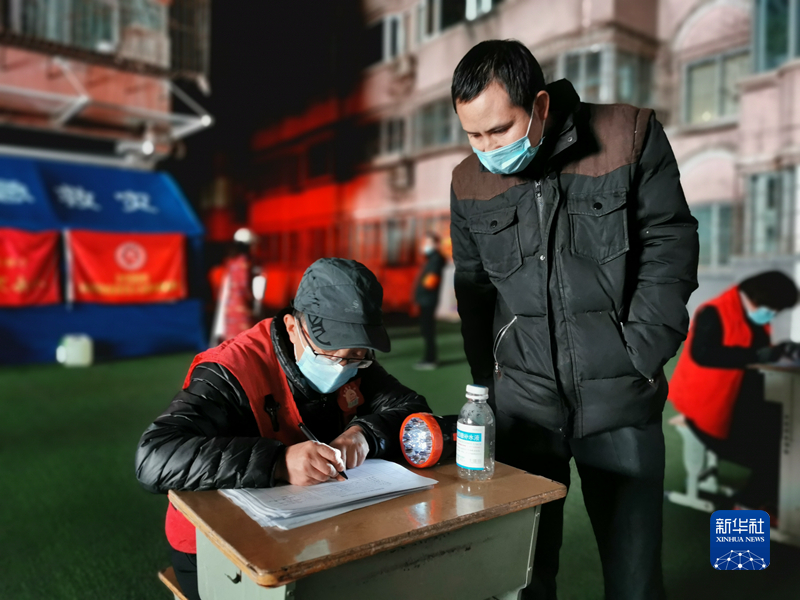 24日晚11点,兰州市城关区酒泉路街道杨家园社区一位社区网格员在做核酸检测登记。(新华社记者何问 摄)