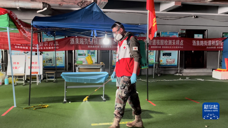 24日晚,志愿者段炜在兰州市城关区酒泉路街道杨家园社区一处核酸采集点进行消杀。(新华社记者龚哲 摄)