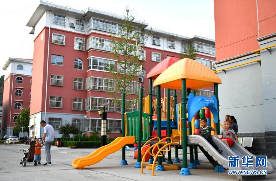 在文安驿镇梁家河小区,孩子们在滑梯上玩耍(7月29日摄)。
