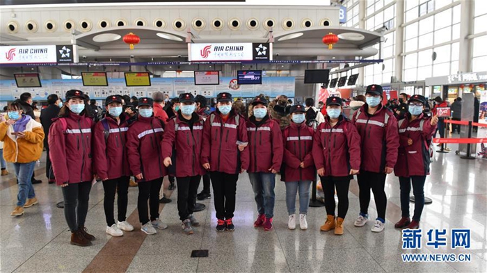 1月28日,由全自治区抽调的139名医务人员及2名带队工作人员组成的内蒙古自治区赴湖北首批医疗队正式启程。这是医疗队一些队员在呼和浩特白塔国际机场大厅合影。 新华社发(贝赫摄)
