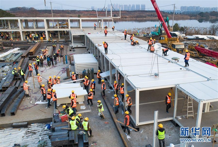 1月28日拍摄的武汉火神山医院建设工地(无人机照片)。目前,武汉火神山医院病房的框架结构已经逐步搭建起来,单层病房框架结构也在加紧建设。 新华社记者 肖艺九 摄