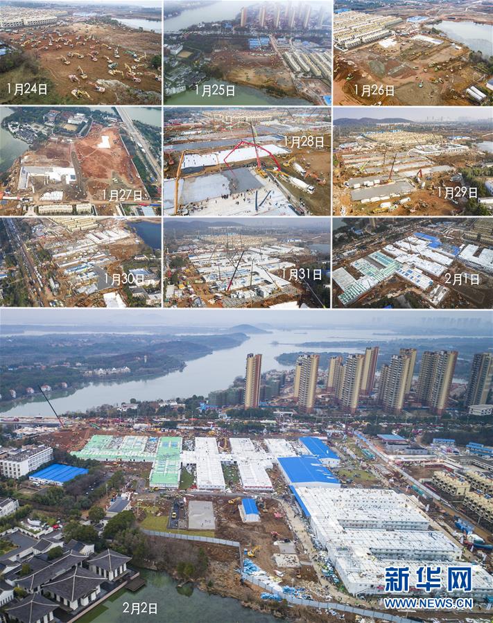 这张标注了日期的拼版照片显示的是武汉火神山医院从开始设计到建成完工,历时10天(无人机拍摄)。 新华社记者 肖艺九 摄