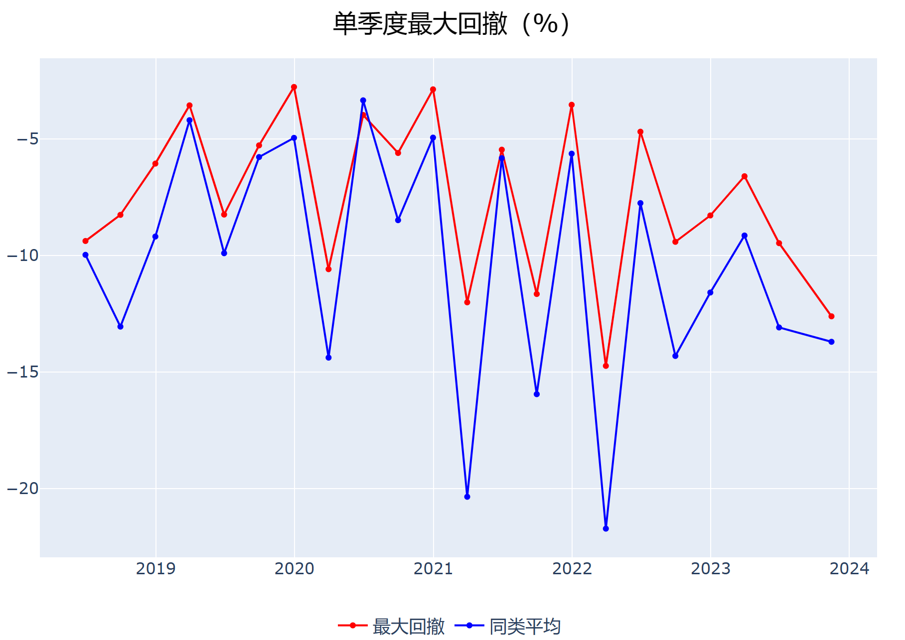 基金近三年最大回撤为-33.57%,同类可比基金排名19/126。其中,单季度最大回撤出现在2022年第一季度,为-14.74%。