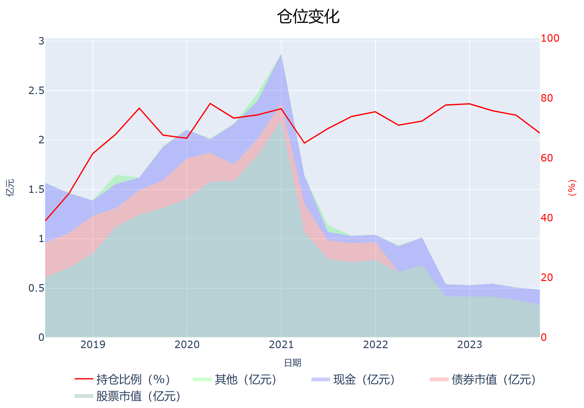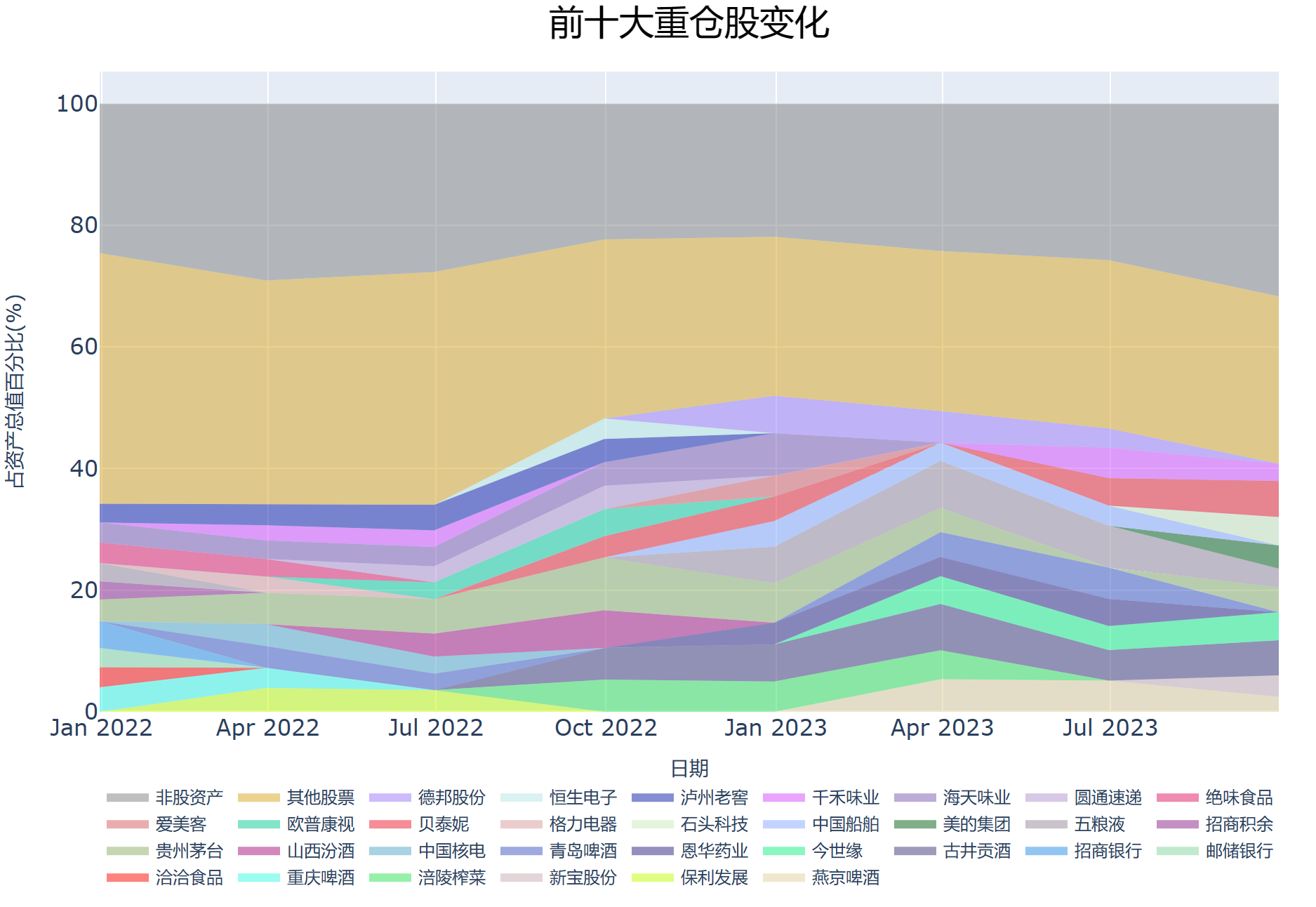 2023年以来该基金持股集中度有所下降,截至三季度末前十大重仓股集中度为59.72%。