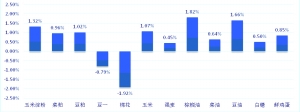 上周监控中心CAFI指数微跌-0.36%至812.72点,成分品种涨跌不一,波动率较低。豆一微涨0.16%。三大油脂中棕榈油大涨3.79%;豆油上涨1.04%;菜油微涨0.54%。谷物中玉米下跌-2.10%;强麦微跌-0.29%。软商品中棉花下跌-1.55%;白糖下跌-1.31%;淀粉下跌-2.93%;鲜鸡蛋大跌-3.63%。粕类豆粕下跌-1.68%;菜粕下跌-1.77%。