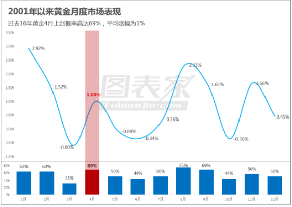 Data Talks 整理了2001-2016的黄金月度走势表现,4月份黄金的平均上涨幅度为1%,上涨概率为69%,这是全年黄金上涨概率第二高的月份。从统计的角度来看,黄金4月份将大概率上涨。