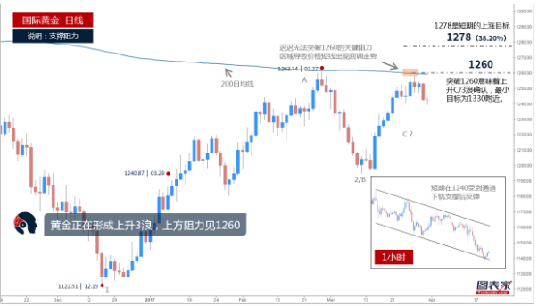 从黄金日线走势来看,价格目前正在形成上升5浪的第3浪。短期内上方阻力为3月高点和200日均值阻力1263附近,一旦价格突破该阻力位置,进一步的上涨目标为斐波那契38.2%回调位1278附近。