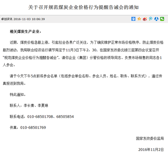 最新消息称,为了切实维护正常市场价格秩序,防止煤炭价格剧烈波动,发改委将于11月3日下午召开“规范煤炭企业价格行为提醒告诫会”。