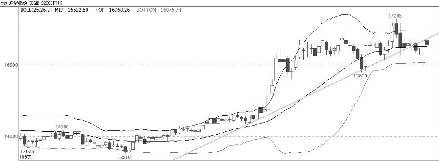 9月初,沪铝指数由前期上涨趋势开始转为窄幅振荡走势,区间为15800—17300元/吨。自7月31日到9月8日的收盘价画一条上涨趋势线,目前价格已经小幅跌破此趋势线。从布林线来看,目前价格仍徘徊于布林轨道中线附近,且布林线上下轨呈水平收窄,表明铝价前期上涨趋势虽已发生改变,但上涨走势并没有被有效转变为下跌走势,目前走势仍处于强势振荡格局中。