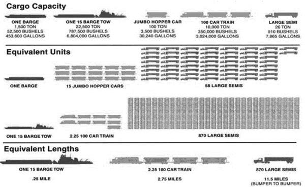 下图很直观地显示了各类运输工具的运力,一辆驳船能装运1500吨大豆,10—20只驳船组成拖船队运往墨西哥湾的港口;一辆大型的漏斗车装运100吨大豆,一辆火车通常由100节漏斗车构成,能装1万吨大豆;一辆大型的半挂车能装运26吨的大豆。可以看出,驳船作为运力最大的运输工具,运输成本较卡车和火车要低很多。从整个内陆运输看,超过六成的美豆到达港口是由驳船运输的,三成左右是由铁路运输的,汽车运输占比较小。