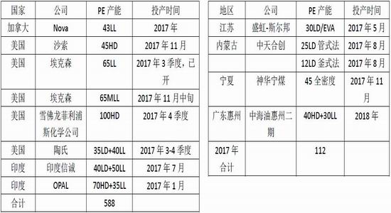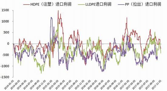 从进口利润来看PE外围价格经常顺挂国内价格打开套利窗口,考虑到PE进口依存度在30%以上,且目前仍处于扩能期,外围大型装置的投产对国内市场形成冲击是必然的,价格中枢下移确定性高。而PP进口利润相对少,对外依存度逐年下降(2016年进口依存约17%),在外围增产不多,国内集中增产的背景下,PP的国内价格已经成为全球低洼价,出口增加的趋势逐渐明显。