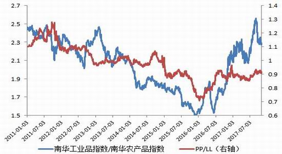 主要逻辑在于产业方面外围投产PE项目对国内市场将形成价格压制,而PP投产不多,主要集中在国内,后期PP进口依存度下降,出口增加的趋势会逐渐显现。需求方面,PP需求更具工业属性,一带一路与基建项目均有利好,消息面中央环保督查即将进驻山东等地,对农膜的传统需求或有利空。另外PP的经济性从2015年显现,对其它树脂也有替代效应。利润方面,PE利润空间相对PP较大,随着投产的增加PE价格中枢下移是比较确定的,PP价格已经成为全球洼地。因此,我们认为聚烯烃在未来一段时间空LL多PP将有不错的利润空间。