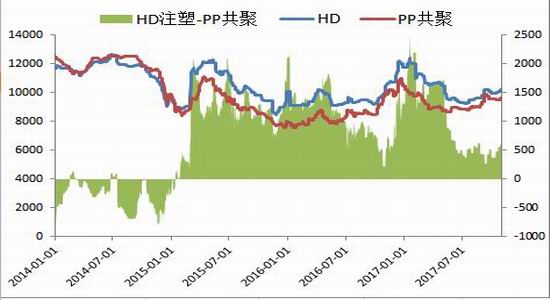 从2015年PP在所有树脂中经济性凸显,对其它树脂类有替代效应。由于PP经济性好于PE,比如在周转筐、物流筐等领域,PP共聚逐渐替代HD注塑,从而通过排产计划传导影响到PP拉丝与LL之间的价差。