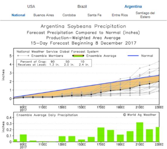 简评:美豆产量未动,出口略降,令结转库存调高,符合预期,而南美数据未动,数据整体显中性。十二月美国农业部供需报告历史上都是一年中最没有行情的报告。南美预计未来10-15天内将有降雨,这缓解了市场减产的担心,下周阿根廷和巴西南部的土壤将获得必需的水分。预计5-6天内阿根廷和巴西南部的天气状况还将维持在干旱的状态。周三阿根廷的西南部可能会有零星的降雨,但是大部分的作物还将处于干旱状态。