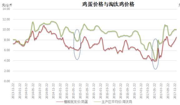 也就是说,4500点以上的蛋价开始影响了消费。若后面蛋价超过5000点,那么终端市场的销售价格则是轻松超过5500点,届时高蛋价对需求的影响将非常直接。(从历史上看,2014年中秋节前的旺季,主产区价格高企,最高价时超过5500点,在销区的走货速度极其缓慢,且产销区价格平水造成贸易商赔钱赚吆喝。)而最近一周现货价格的冲高回落,则使得部分养殖户开始主动加速淘汰老鸡,这无疑为未来一个月现货行情的上涨奠定了基础。