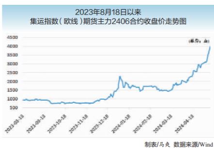 近期,航运股期标的表现亮眼。5月13日,集运指数(欧线)期货(简称“集运期货”)主力2406合约价格再创新高,并突破4000点整数关口,远月2408、2410、2412、2502、2504合约更是全线涨停;A股海运指数涨超4%,领涨其他主题行业指数,多只成分股涨停或涨超10%。